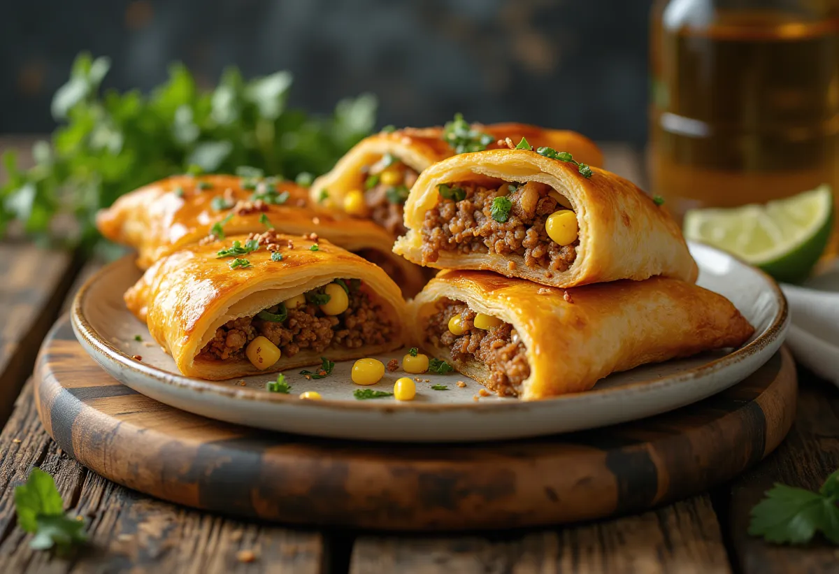 Přehněte do tvaru trojúhelníku, okraje přitlačte vidličkou. Povrch potřete rozšlehaným vejcem a na několika místech propíchněte.