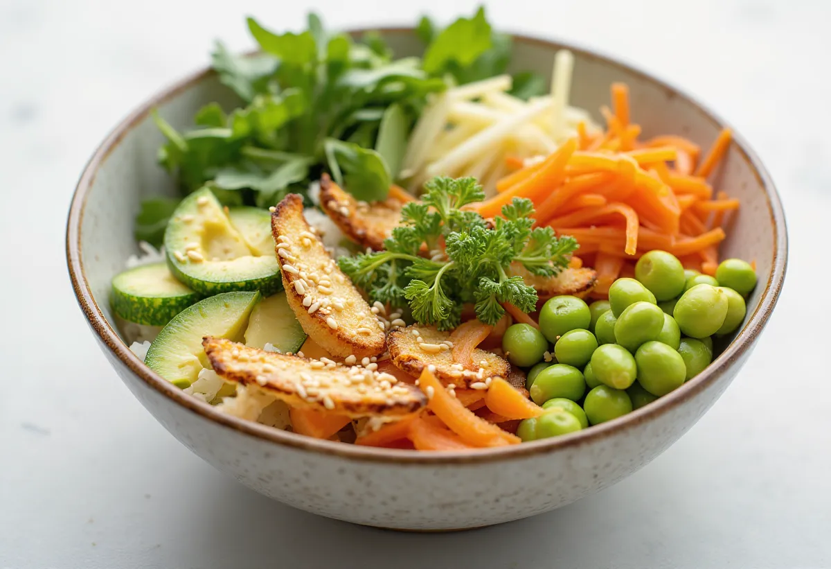 Tato 'Sushi Bowl' je určena těm, kteří milují čistotu japonských chutí, ale chtěli by se vyhnout sacharidové rýži, nebo jen touží po lehkém, křupavém obědě. Zde přebírá hlavní roli zelenina: umělecky nakrájené tenké proužky jsou nejen efektní, ale dodávají i vzrušující texturu. Zálivka plná umami a krémové avokádo se postarají o to, abyste absenci rýže nepocítili.